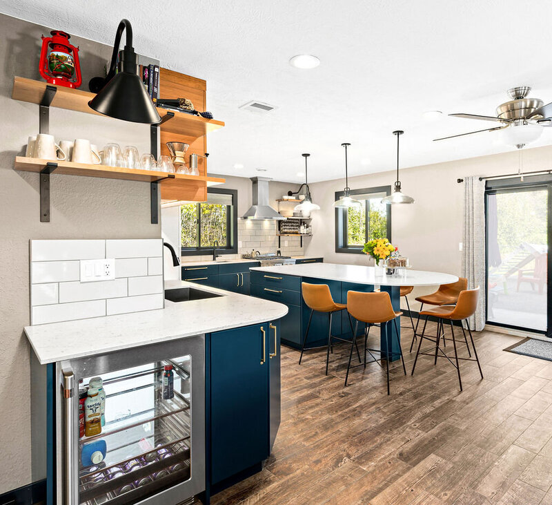 Layered with warm woods, deep blue cabinetry, and industrial-inspired lighting, the kitchen balances high function with personal style to support meals, messes, and memories in equal measure.